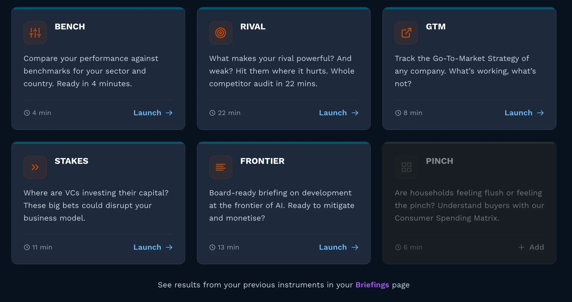 Choose what to monitor - raw material costs, competitors, capital flow, consumer spending, we add new instruments every week.